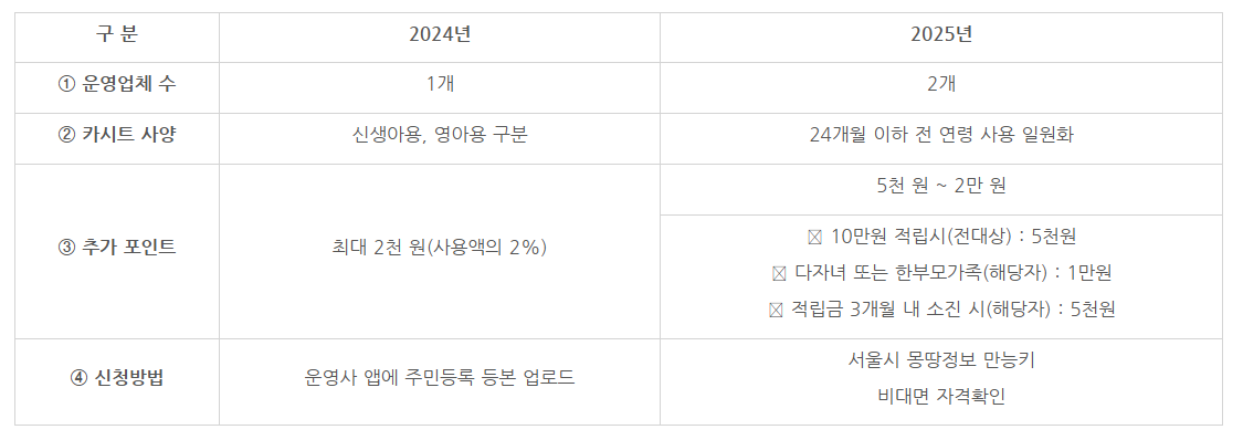 - 서울 거주 24개월 이하 영아를 양육하는 부모 또는 실질 양육자(23.1월생부터)
