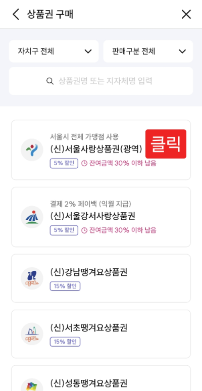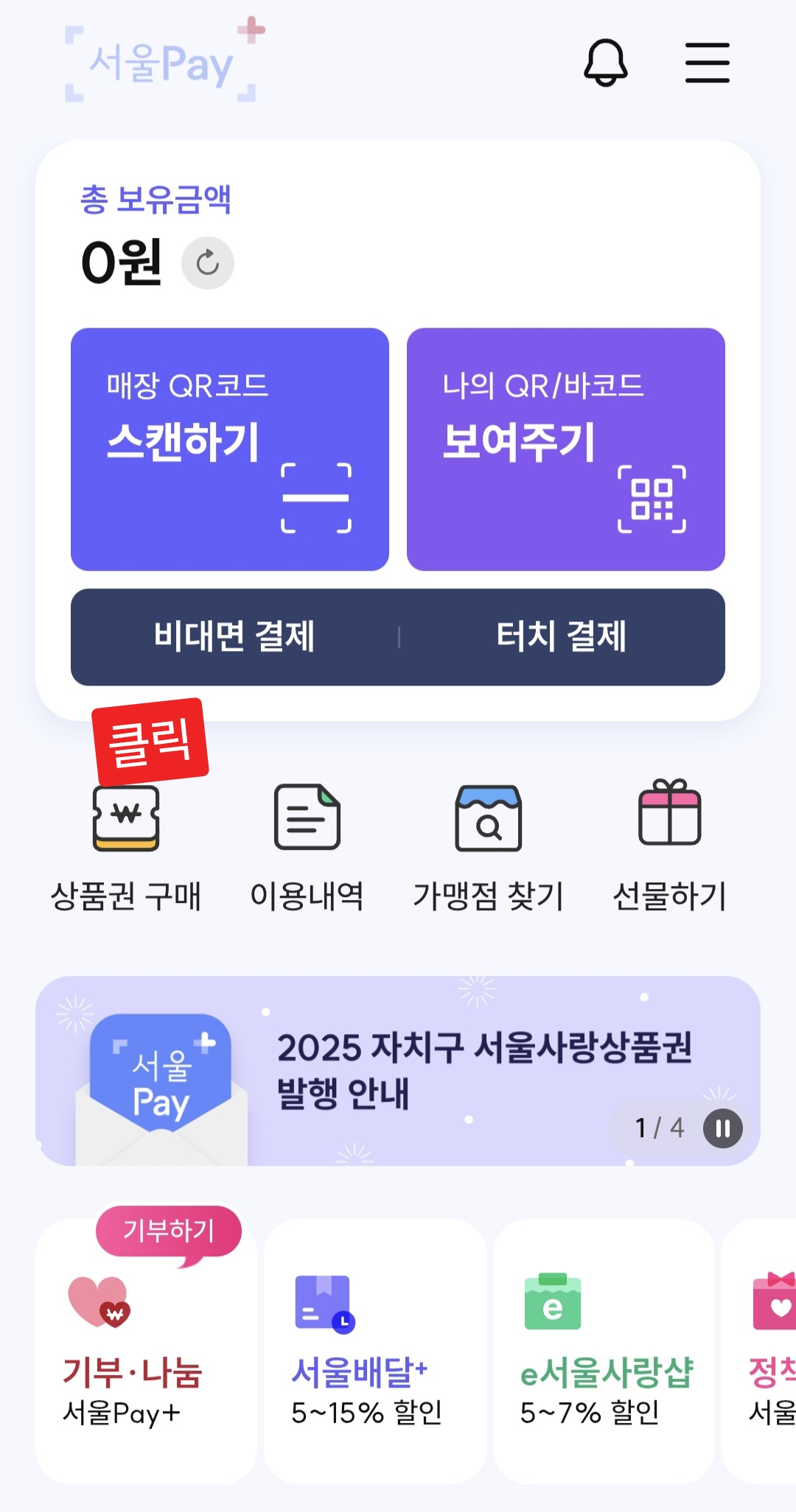 - 앱 내에서 서울사랑상품권 구매 메뉴를 찾습니다.