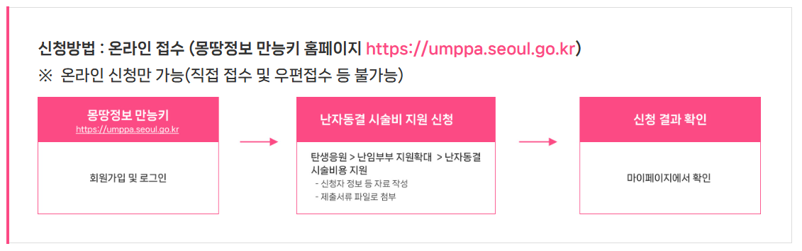 난자동결 시술비 지원은 온라인 접수만 가능하며, 방문 접수는 불가합니다. 아래 절차에 따라 신청하세요.