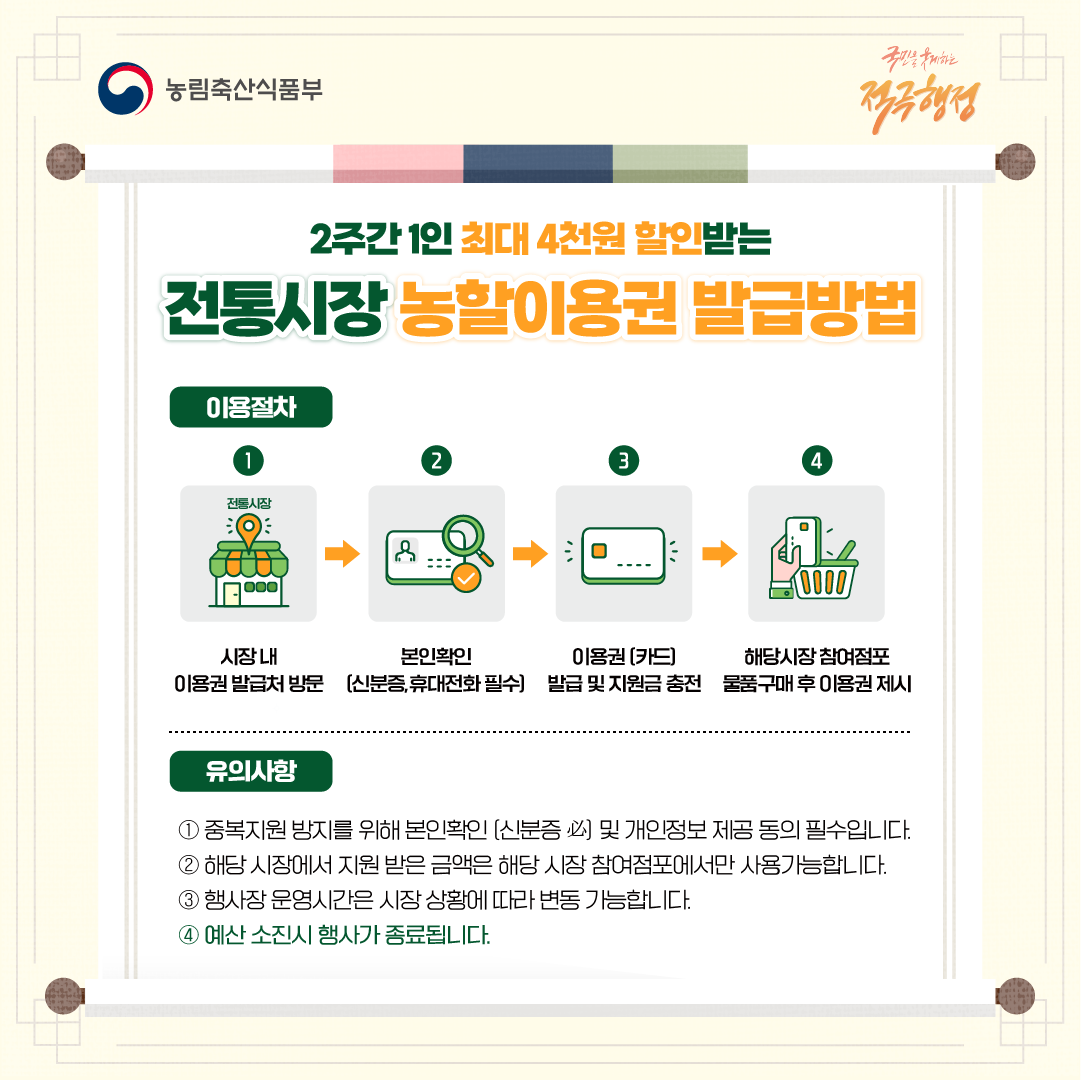 팁: 사용처는 해당 전통시장의 농축산물 판매점에 한정되며, 사용 기한을 꼭 확인하세요.